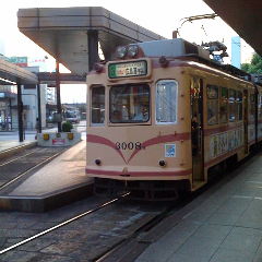 写真は、広島駅前で停車する路面電車。新しい携帯電話で撮影。広島では、低床の新型もたくさん走っていた。このあとの散歩では一枚も撮影しなかった。