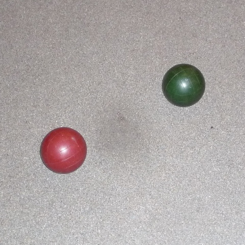 写真は、ボウリングとカーリングを素朴にしたような“bocche ball”のボール。砂の上で重いボールを転がし合い、最初に投げておいた小さな銀玉に近づいたほうが勝ち。この場所には前にも来たことがある。“猫の街”の遊技場の風景。