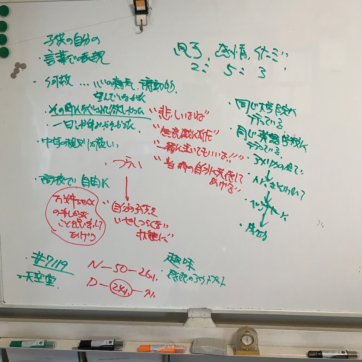 カウンセラーはやはり聴き上手だった。私が質問を出したためにそれに答える形で面談は始まった。でも、回答が一方的に提示されるわけではなかった。カウンセラーの問いかけに対してとりとめなく私が返す断片的な言葉をホワイトボードに書き出していく。まるで二人でブレインストーミングをしているような感じ。