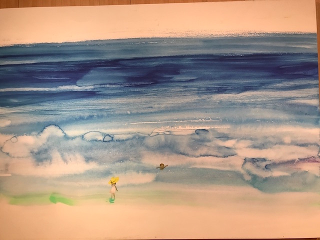 幅が2メートル近くに拡大された海と二人の子。はじめからこの大きさのキャンバスに描いたと思うほど、拡大してもぼやけるところがない。
