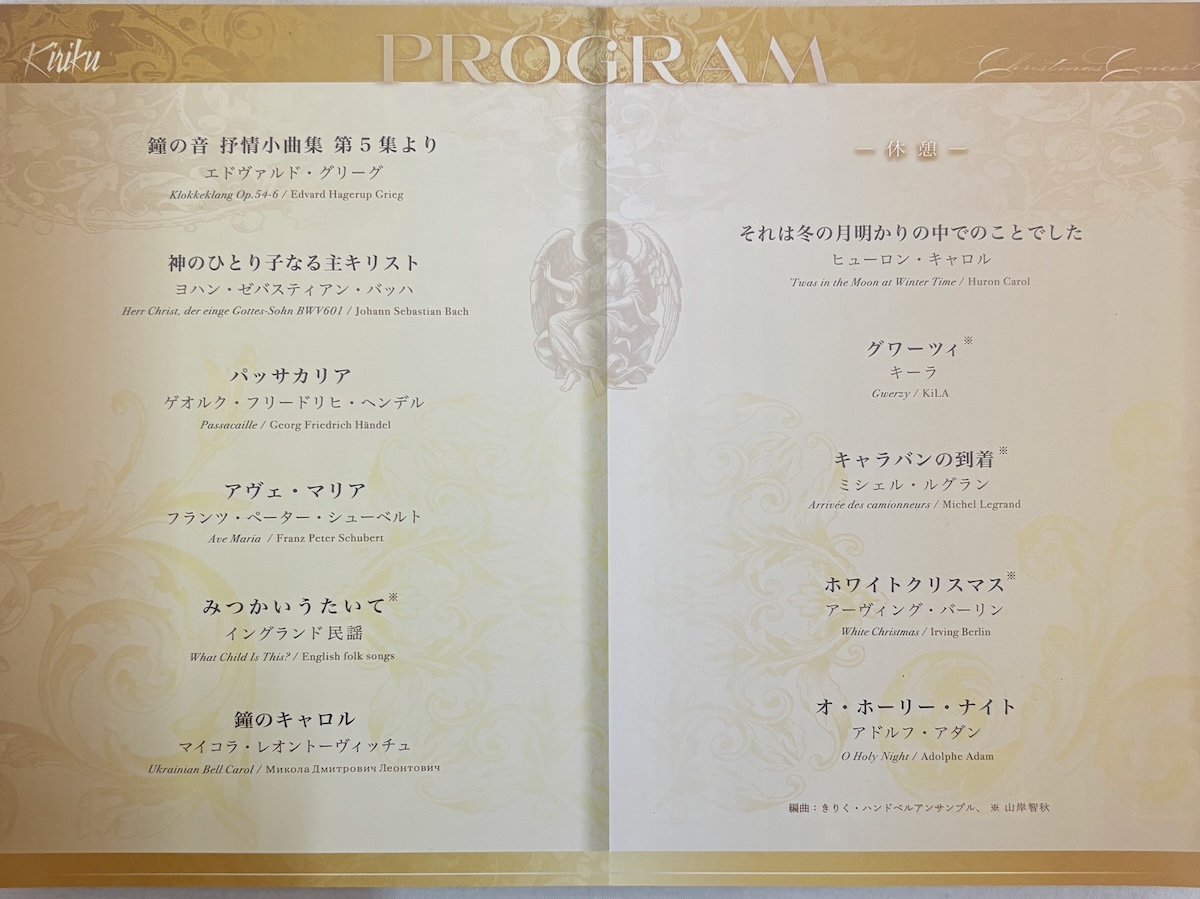 今回はクリスマス色の強い構成。有名な曲でも前奏や間奏が複雑な編曲になっていて、超絶技巧を存分に堪能することができた。プログラムの最後はお馴染みの"O Holy Night"。この曲をベルで聴くと年の瀬を感じる。アンコールに"Silent Night"を皆で歌って終了。